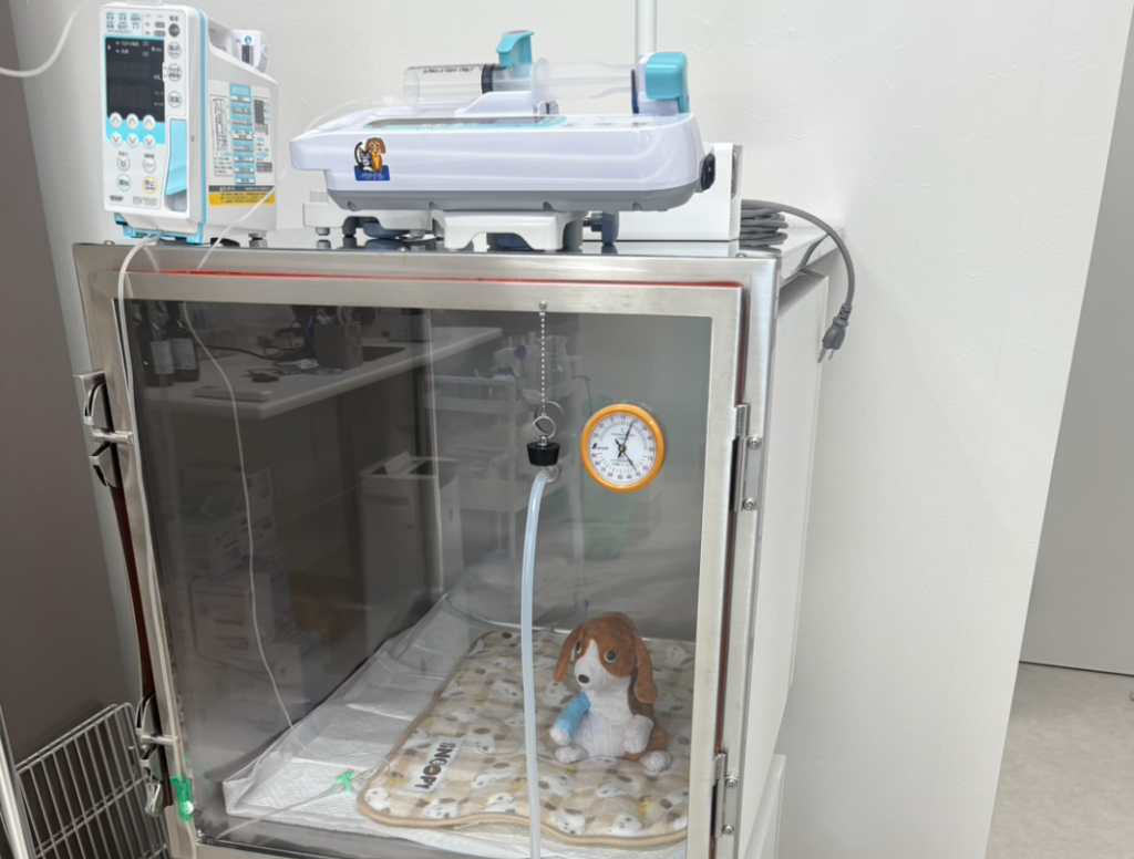 呼吸が苦しい動物のために酸素濃度を調整できる専用スペースです。ネブライザー治療にも対応し、呼吸器症状のケアを行います。